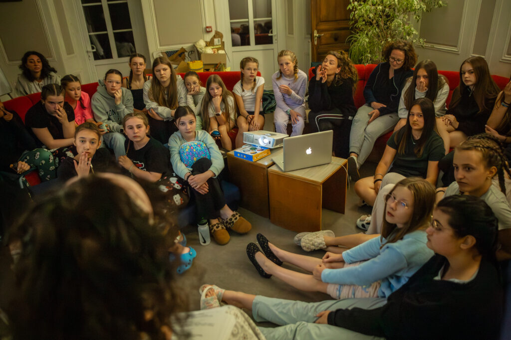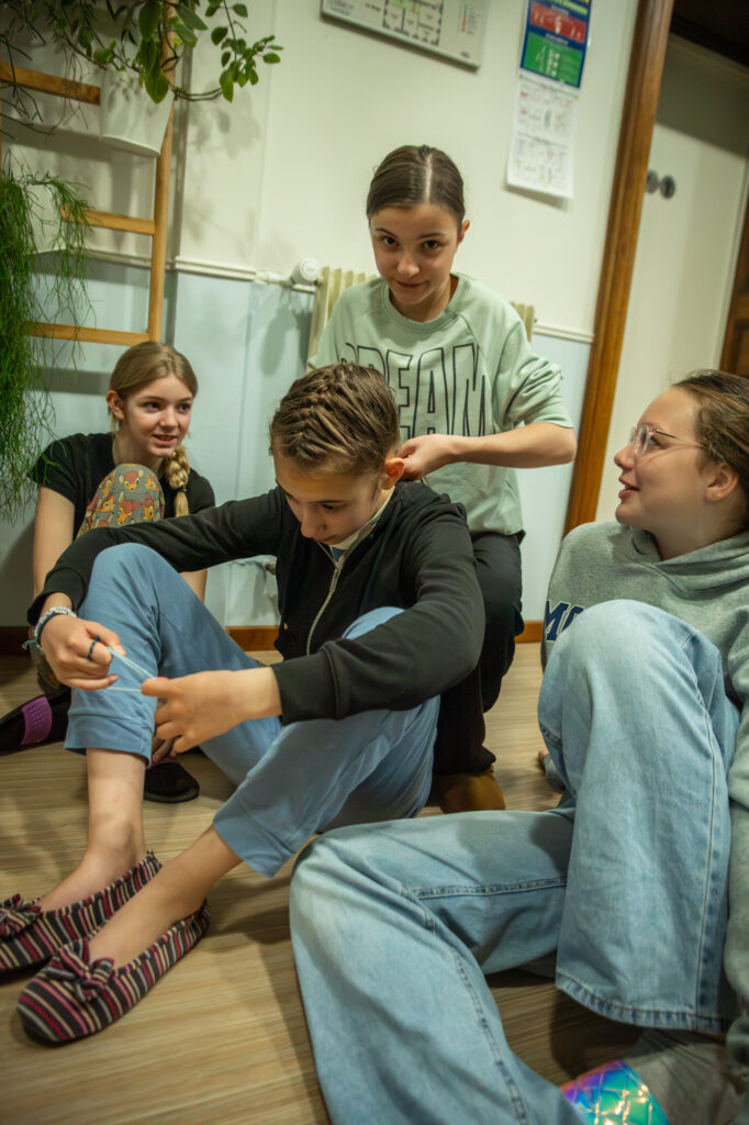 En attendant la veillée de ce mardi soir, le couloir s’est transformé en salon de coiffure improvisé. Tresses, essais de styles, coups de main des animateurs… (enfin surtout des animatrices 😄) ça papote, ça rigole, et ça se prépare tranquillement pour la suite.